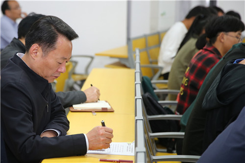 虞爱华一行首先来到天工教学楼303教室,听取了李子煊副教授正在讲授的《思想道德修养与法律基础》课程,虞爱华一边认真听讲,一边认真记录,并在课后与李子煊进行了亲切交流,对其课堂教学效果给予充分肯定,认为是一堂精彩的思政课。他还与授课老师就教学内容和方法等进行了现场交流和探讨。
