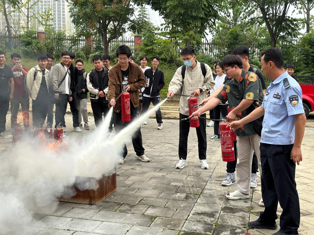 讲座中,彭广峰结合了近年来校内外的火灾事故实例强调了安全用电的重要性,带领大家学习了关于火灾预防、初期火灾的扑救方法、用电的注意事项以及如何逃生自救等消防基础知识。在互动环节,同学们认真学习了几种常见消防设备的正确使用方法,并有序开展了灭火实操演练。