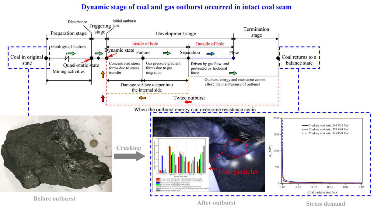 该研究对原生煤的力学及甲烷扩散特性进行回顾,并测定原生煤的破碎比功,获得原生煤的基本特性。同时,归纳突出的特征现象,细化突出的各个阶段,分析突出的能量来源。然后,基于原生煤破裂、破碎的应力条件及搬运过程的粉碎条件研究,结合真实的案例计算,获得原生煤发生突出的最小应力。研究表明,利用f值为0.59-1.57的3种原生煤颗粒测得的原生煤破碎比功范围为294.3732 - 945.8048 J/m2。根据案例计算,突出煤/岩的搬运消耗超过2300 MJ的搬运功,这需要10062.09、7046.57和5895.47 m3的瓦斯参与膨胀做功,当煤层初始瓦斯压力分别设定为1.0 MPa、2.0 MPa和3MPa时。然而,突出过程煤体破碎消耗的破碎功超过了搬运功,甚至达到了搬运功的13.96倍。如何提供如此巨大的破碎功是原生煤发生突出的限制因素。应力能提供了原生煤破碎的主要破碎功,这决定了原生煤发生突出所需的最小应力超过了54.35 MPa,甚至达到300.44 MPa。显然,最小应力远高于目前300-700m开采深度所能提供的水平应力和垂直应力,间接证明了目前开采深度原生煤发生突出(尤其是大型突出)的可能性较小。然而,进入更深的开采深度,高应力下,原生煤发生突出的应力条件可能逐渐满足;并且高瓦斯压力下,原生煤发生突出的可能性将大幅增加。